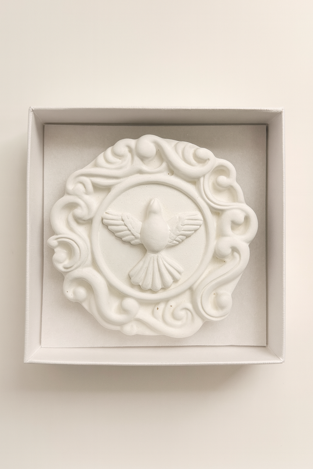 O Espírito que acalma e protege. Em cada detalhe desta peça em gesso perfumado vive uma promessa de fé, paz e renovação. O Espírito Santo é o símbolo de luz e proteção, é aqui moldado com delicadeza e carinho para tocar corações, perfumar memórias e guardar momentos especiais. Ideal para oferecer em comunhões, crismas ou simplesmente como lembrança de fé.